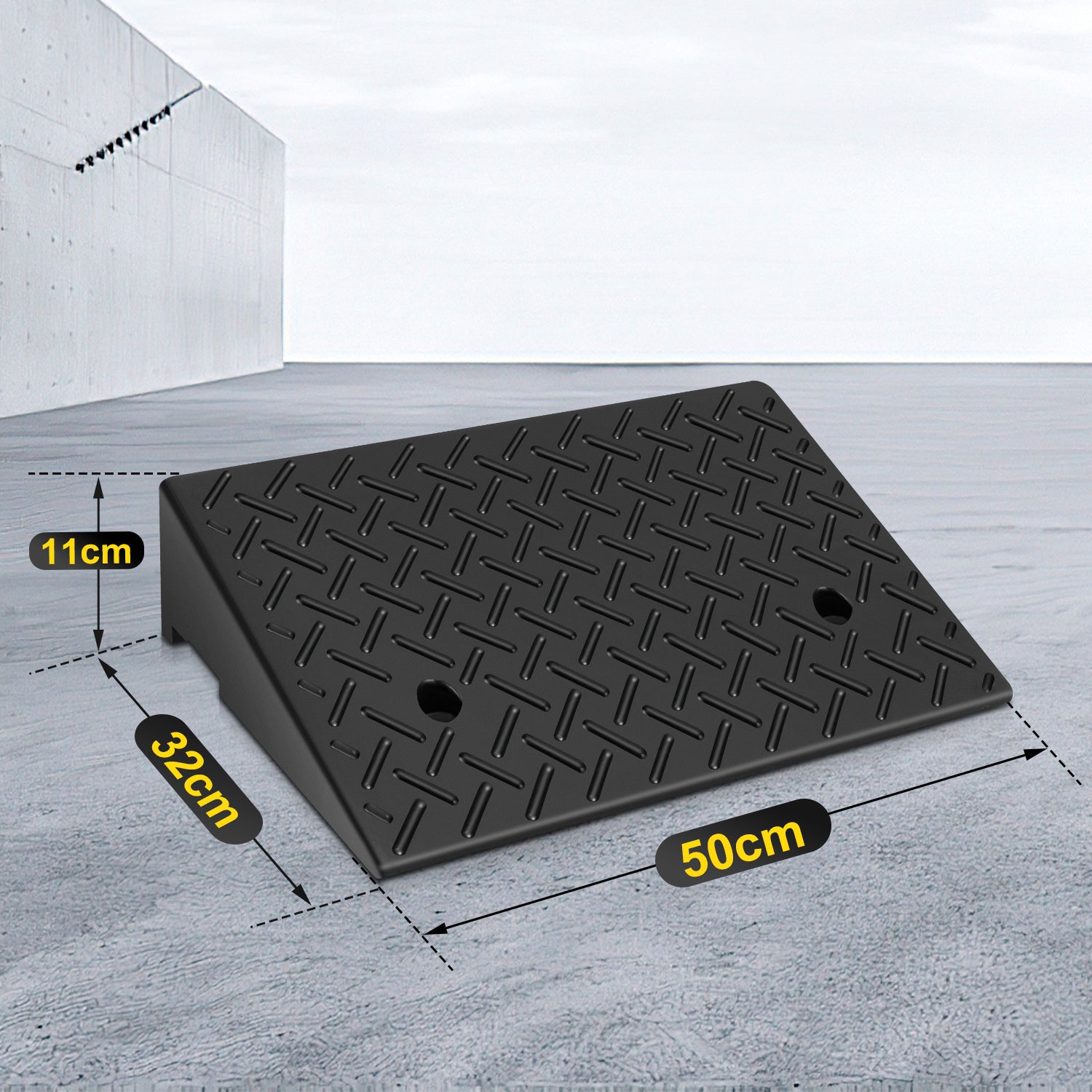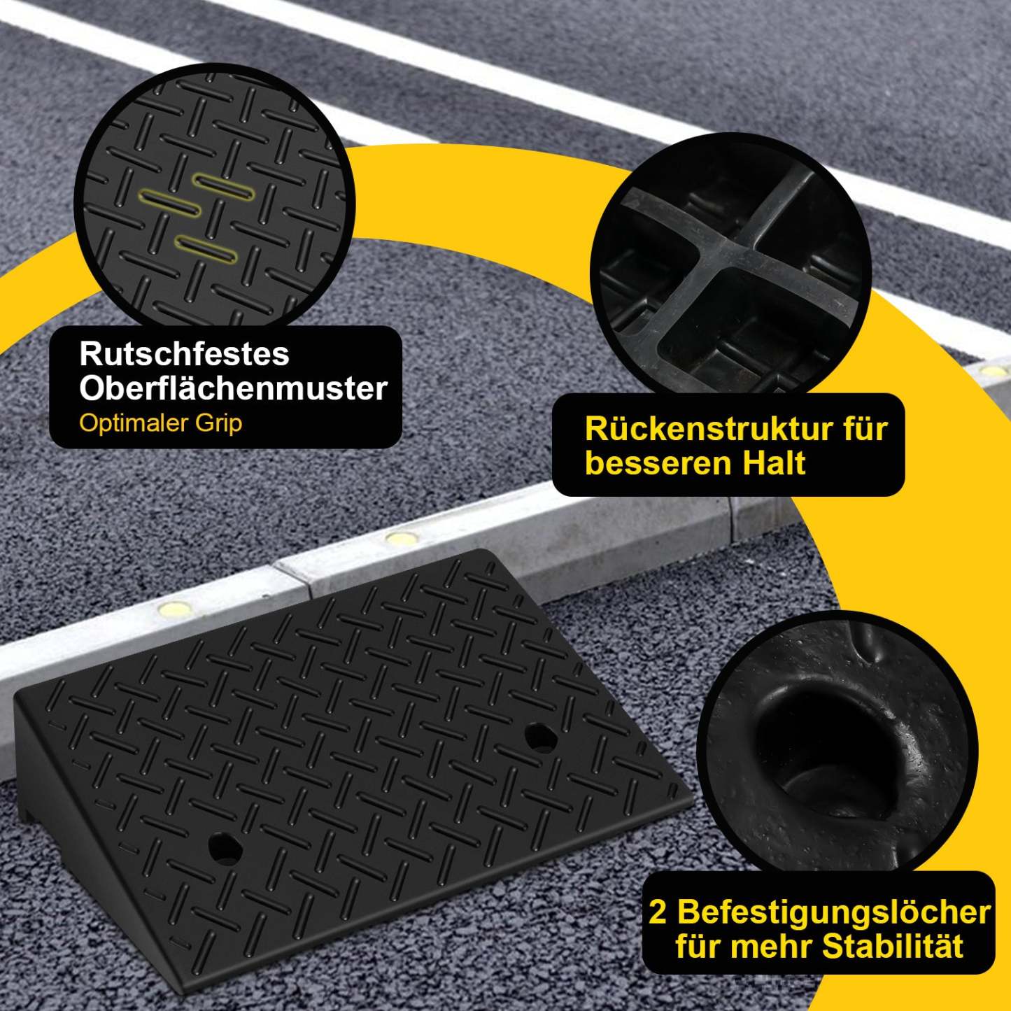 【Ein sehr praktisches Design】Der Bordsteinrampe Gummi hat 2 Löcher an der Unterseite, was sehr praktisch und einfach zu installieren ist. Mit 2 Löchern kann Einfache Entwässerung zur Vermeidung von Staunässe, Dadurch ist es weniger rutschig und sicherer.
