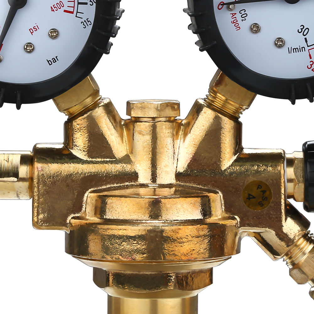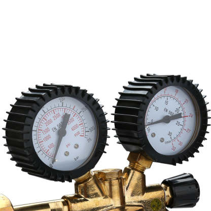 Der Druckminderer Argon/CO2 besitzt den deutschen Standardanschluss, W 21,8 x 1/14". Zwei Manometer, eins für Flaschendruck und eins für Ausgangsdruck. Bei den Messuhren handelt es sich um Präzisionsinstrumente nach DIN.