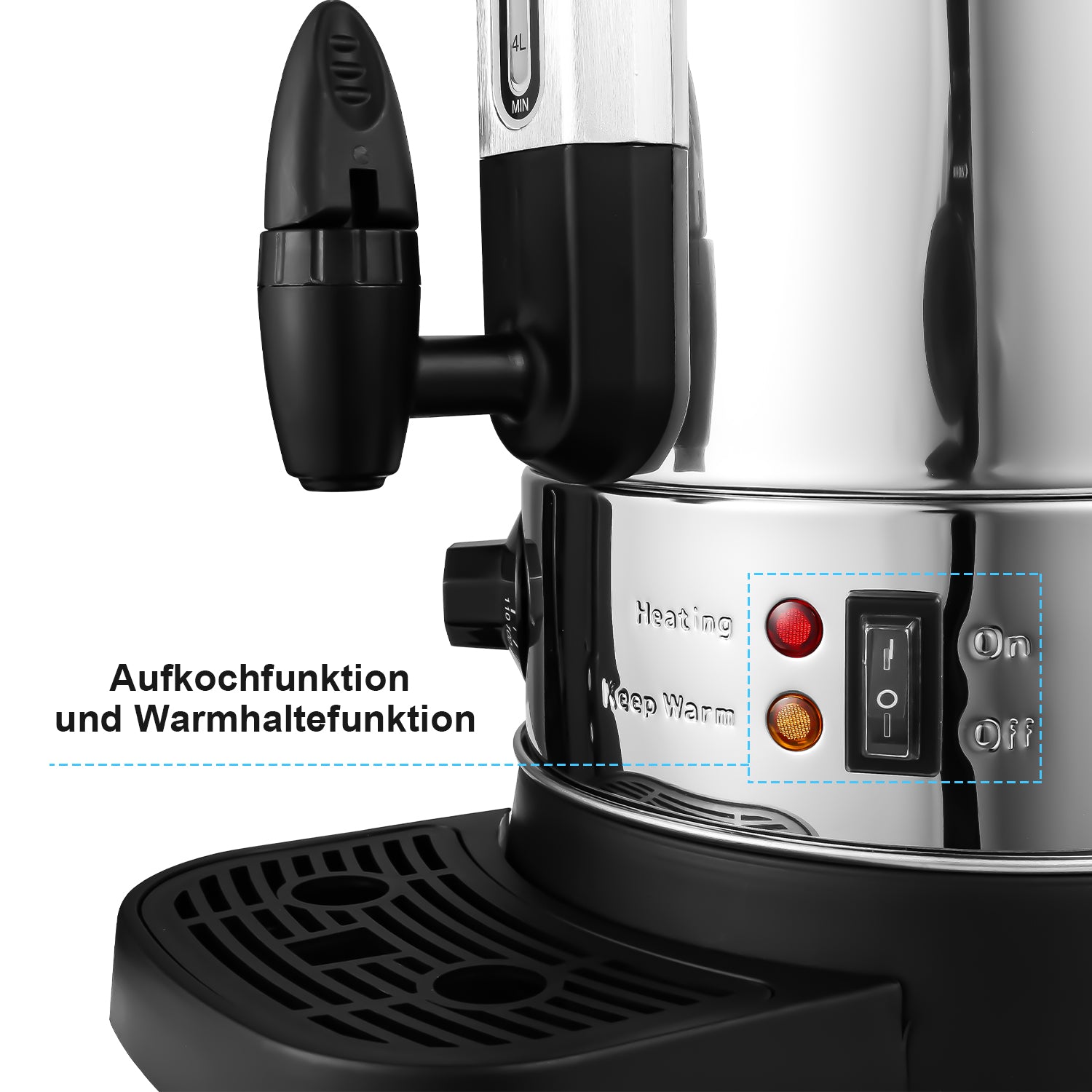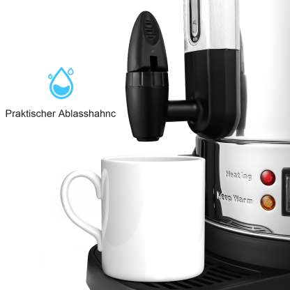 Einfach und bequem: Der Wasserhahn sorgt dafür, dass Heißgetränke einfach und sauber ausgegeben werden können und die praktische Tropfschale fängt die auslaufende Flüssigkeit auf und hält den Tisch sauber. Die Wasserstandsanzeige zeigt deutlich an, wie viel Heißgetränk sich im Behälter befindet, so dass der Deckel nicht geöffnet werden muss.