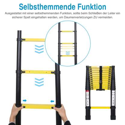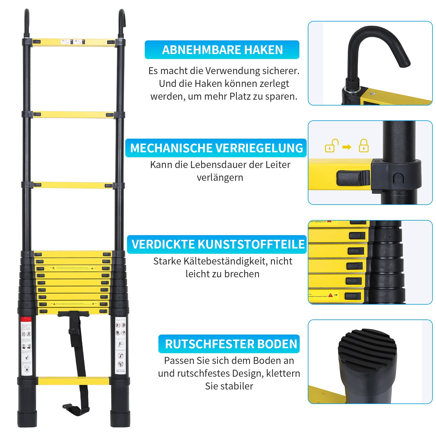 ✨Sicher und Zuverlässig: Zwischen den Sprossen ist Finger Sicherheitseinstellungen vorhanden, um das Einklemmen der Finger beim Ein- und Ausfahren zu verhindern. Die rutschfesten Gummifüße und die abnehmbaren Haken machen die Teleskopleiter stabiler und bieten Ihnen maximale Sicherheit, wenn sie vollständig ausgezogen ist.