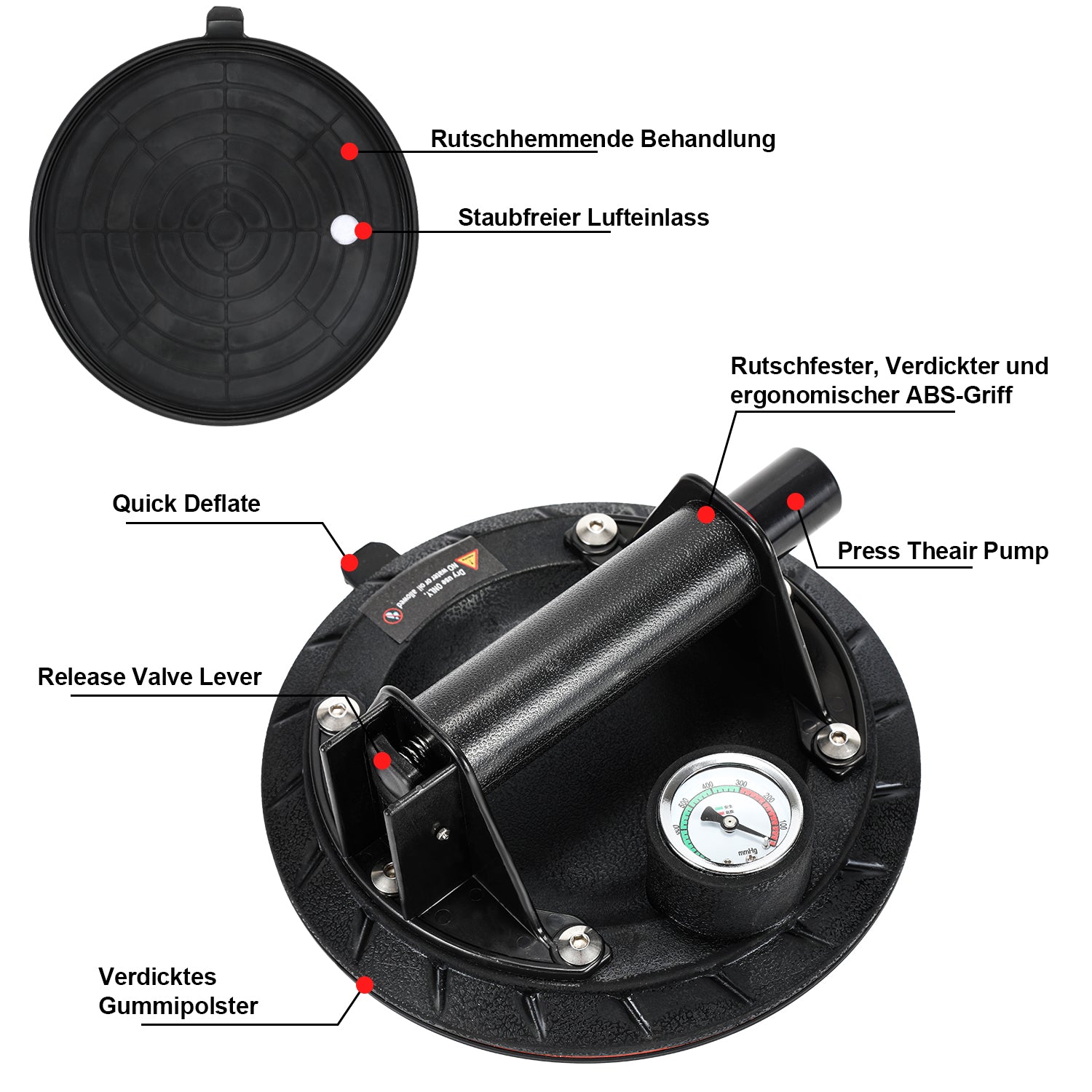 Luftdruckmesser: Der Vakuumsauger wird mit einem Luftdruckmesser geliefert, so dass Sie den Luftdruck des Saugers immer im Auge behalten können