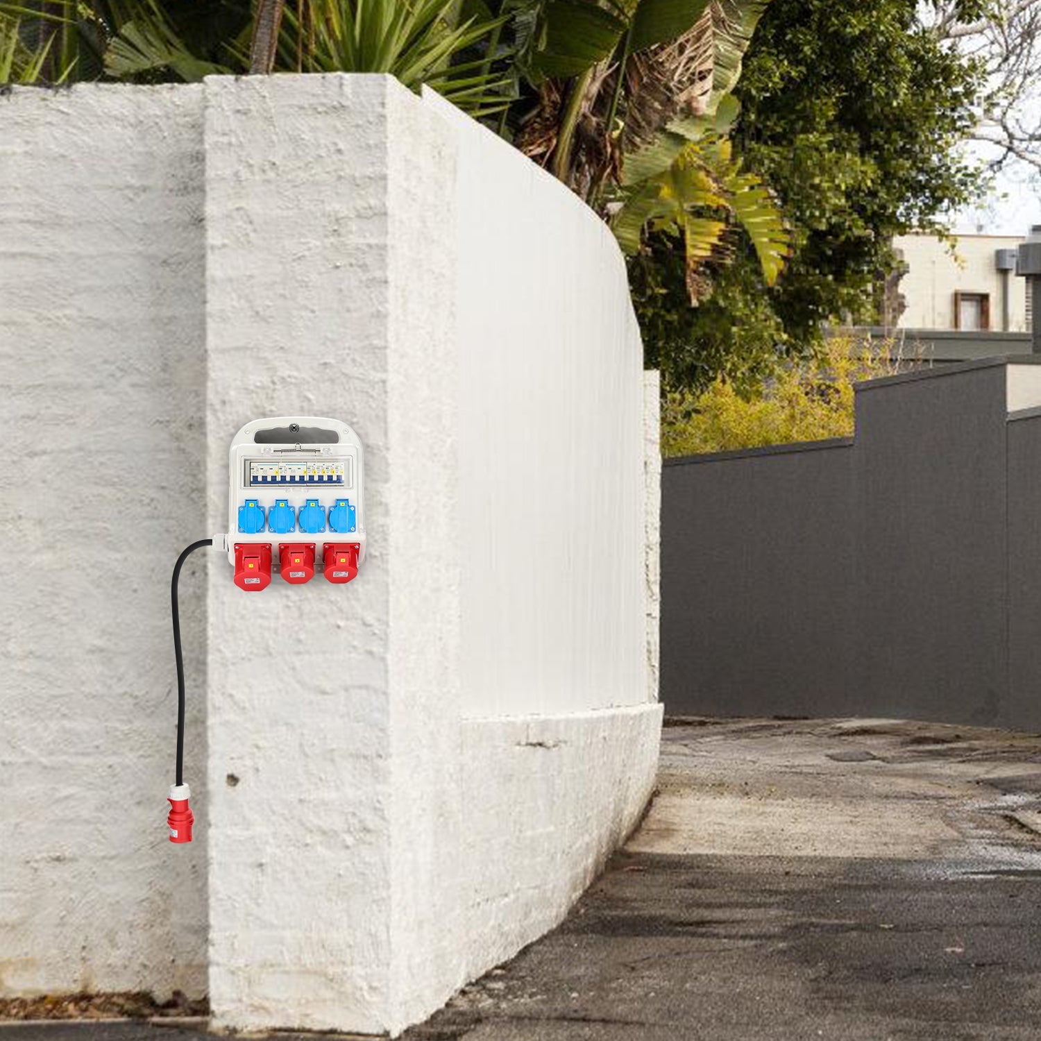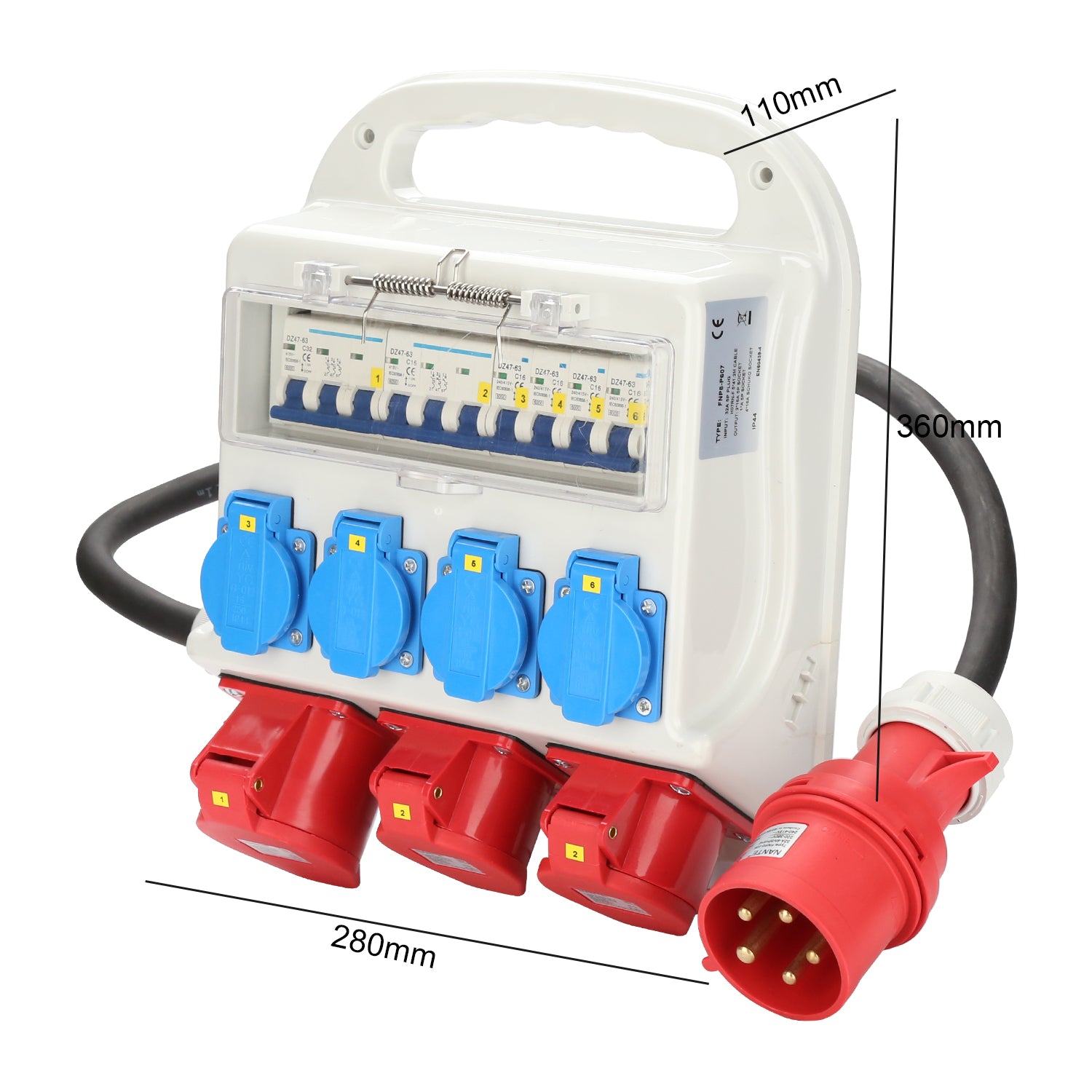 Material: Gehäuse und Montageplatte bestehen aus strapazierfähigem Spezialkunststoff und sind von zuverlässiger Qualität. Alle Abgänge sind mit integrieter Sicherung abgesichert. D.h. die Schukosteckdosen sind jeweils einzeln mit einem Sicherautomat 16A und die CEE 400V-16A bzw. CEE 400V-32A Steckdosen zusammen abgesichert. Sicherheit und sichere Verwendung.