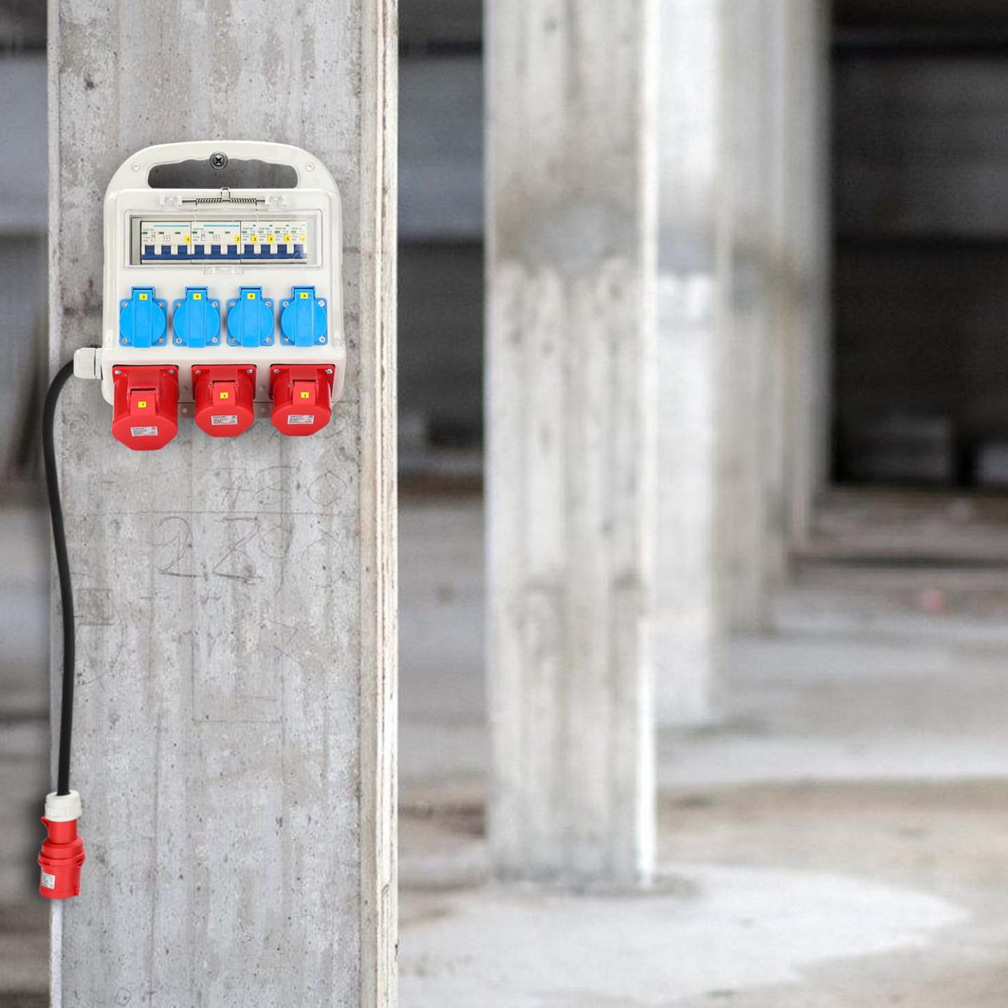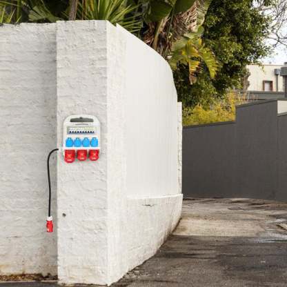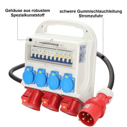 Ein- und Ausgang: CEE -Kupplung 400 V / 32 A 5- polig mit 1,2 m Leitung, 4 x Schutzkontaksteckdosen 230 V /16 A, 2 x CEE 400 V /16 A 5 polig,1 x CEE 400 V /32 A 5 polig. Der Außenmantel besteht aus hochfestem Spezielkunststoff.