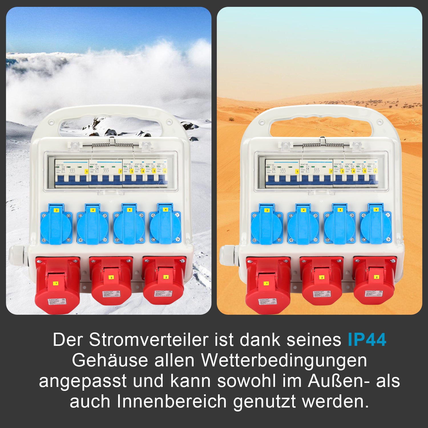 - Schutzart der Steckdosen IP 44, Spritzwassergeschützt