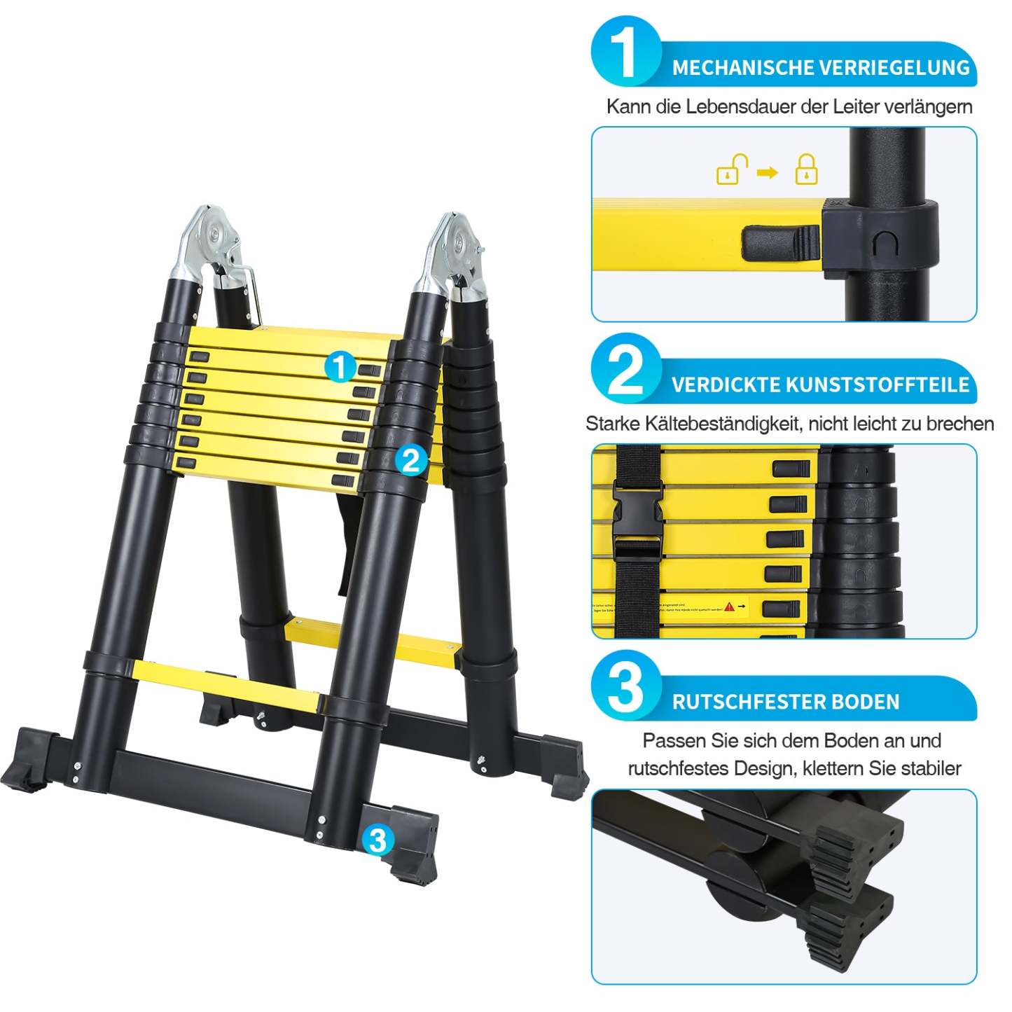 Sicher und Zuverlässig: Zwischen den Sprossen ist Finger Sicherheitseinstellungen vorhanden, um das Einklemmen der Finger beim Ein- und Ausfahren zu verhindern. Die rutschfesten Gummifüße und die abnehmbaren Haken machen die Teleskopleiter stabiler und bieten Ihnen maximale Sicherheit, wenn sie vollständig ausgezogen ist.