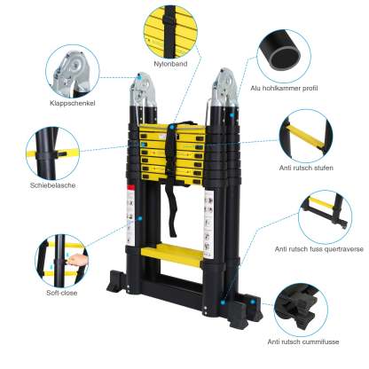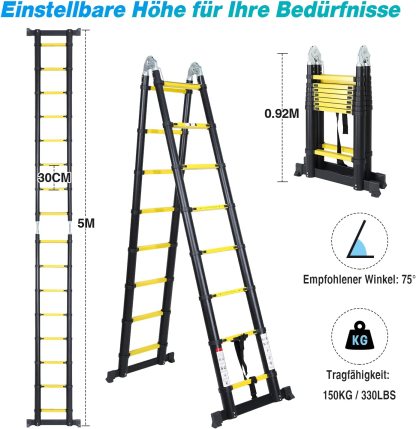 Klappbare Teleskopleiter:Die Leiter nimmt ein Klappdesign. Bei jedem Schritt wird der Sicherungsstift automatisch gesperrt, sodass die Leiterhöhe nach Bedarf angepasst werden kann.