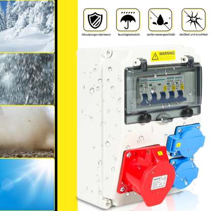 Sicherheit:Alle Abgänge sind mit integrieter Sicherung abgesichert. D.h. die Schukosteckdosen sind jeweils einzeln mit einem Sicherautomat 16A und die CEE 400V-16A bzw. CEE 400V-32A Steckdosen zusammen abgesichert. Sicherheit und sichere Verwendung.