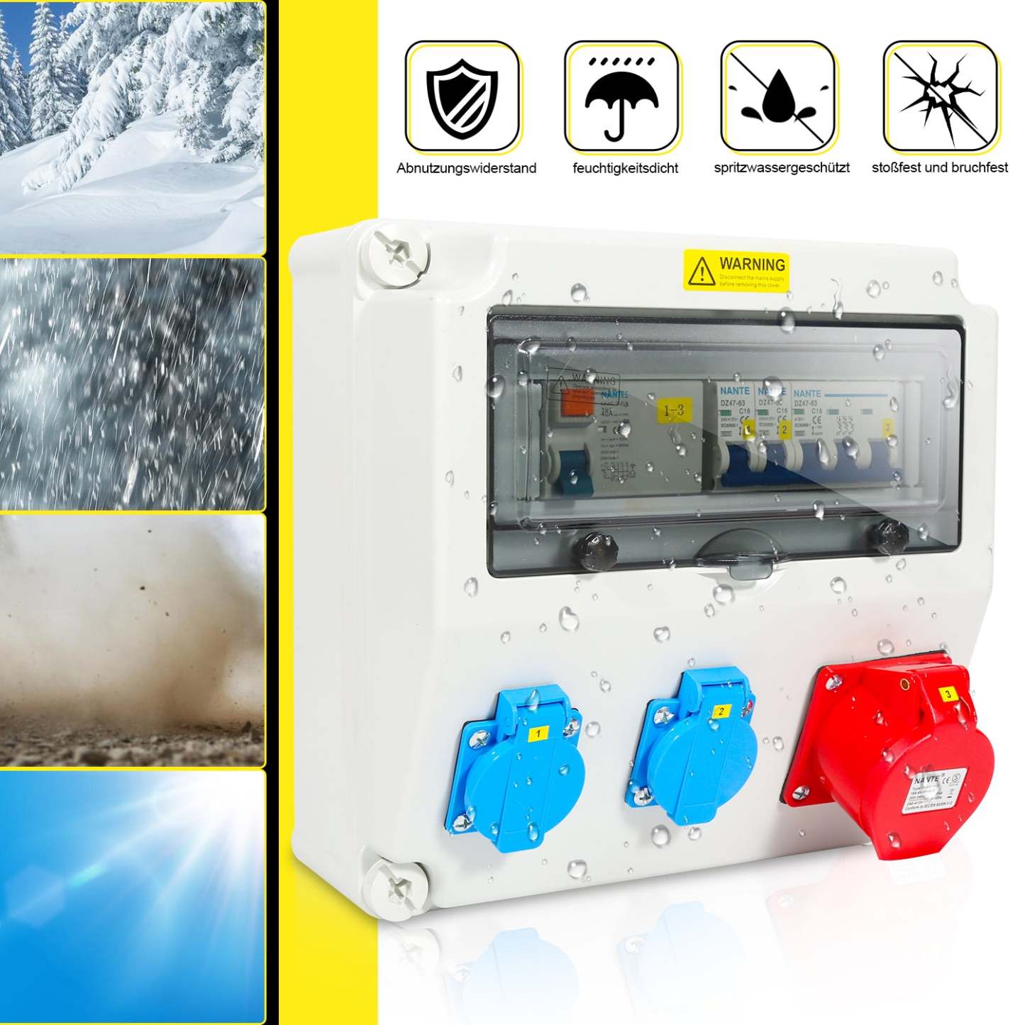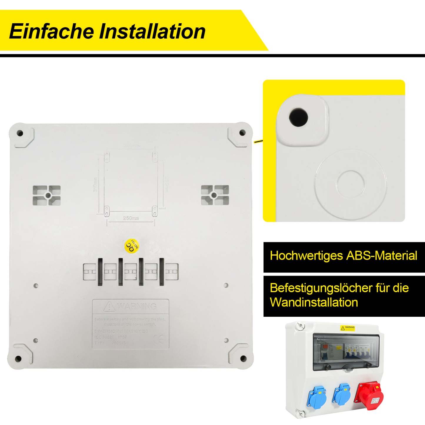 - Das Gehäuse des Wandverteilers besteht aus hochwertigem ABS-Kunststoff, der sehr robust, langlebig, isolierend, feuchtigkeitsdicht und nicht tropfend ist